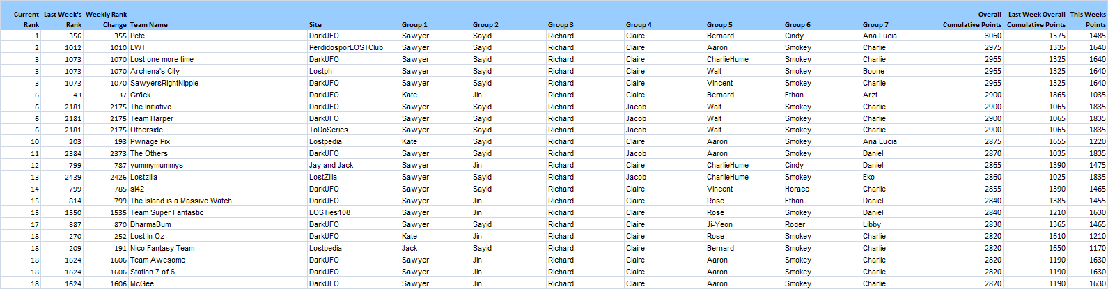 Una semana más, os traemos los resultados de la Liga Fantástica, actualizada con los puntos obtenidos en el capítulo 6x09 - 'Ab Aeterno' ("Para Toda la Eternidad"). Por cierto, la clasificación ha dado un vuelco espectacular debido a la enorme cantidad de puntos obtenidos por Richard Alpert.